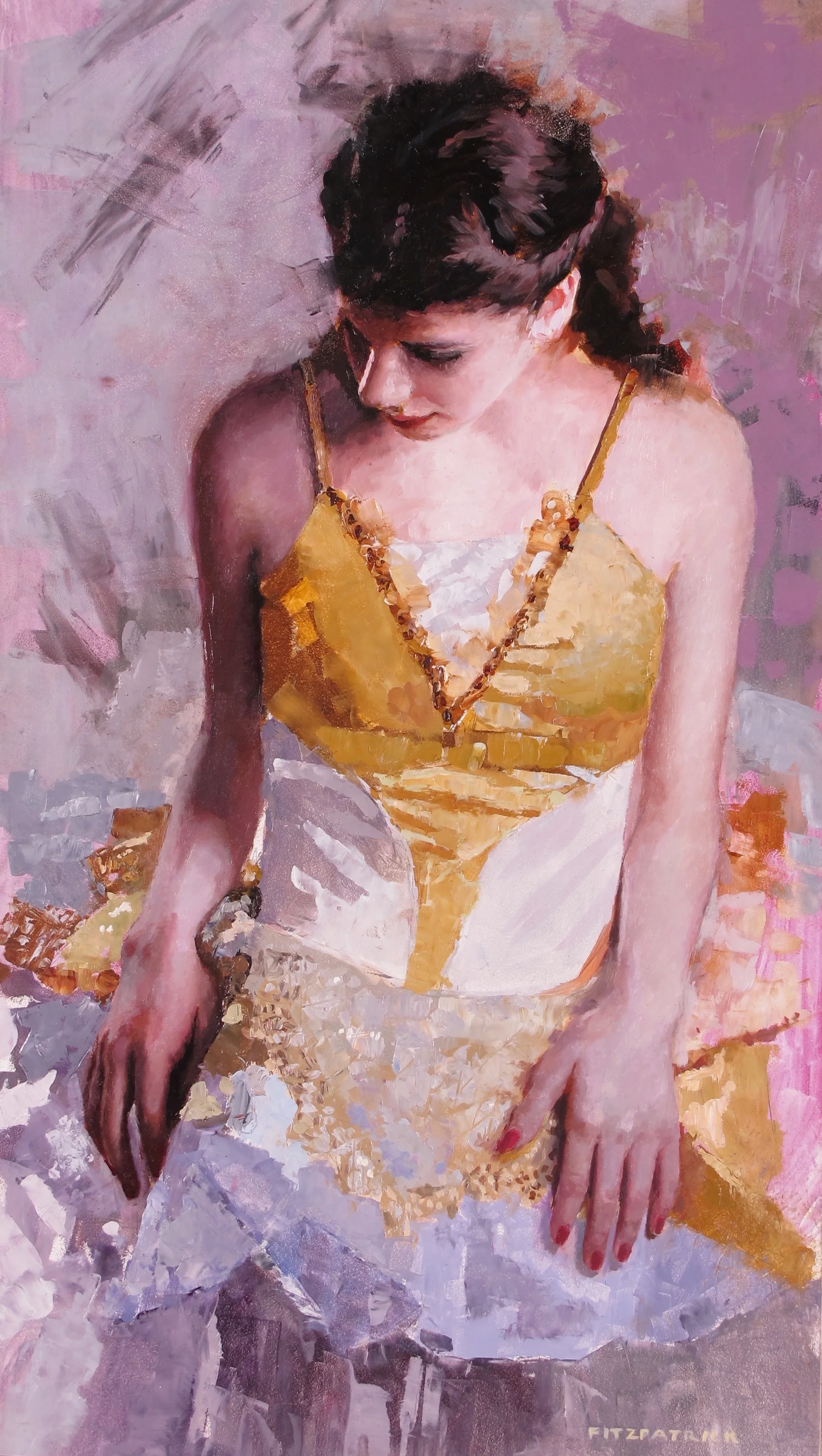 A: I have always been interested in painting figurative. The evolution has been in technique. I started with indirect glazing. The next move was to direct brushwork. I am currently working with a combination of brushwork, squeegee, rollers and palete knife. Subject matter to me is fluid. I try to talk to the viewer on a deeper level than the subject being painted so they are drawn into the painting and make up their own story. One technique I use is to set up a “dance” between resolved elements and the unresolved - the real and the abstract.